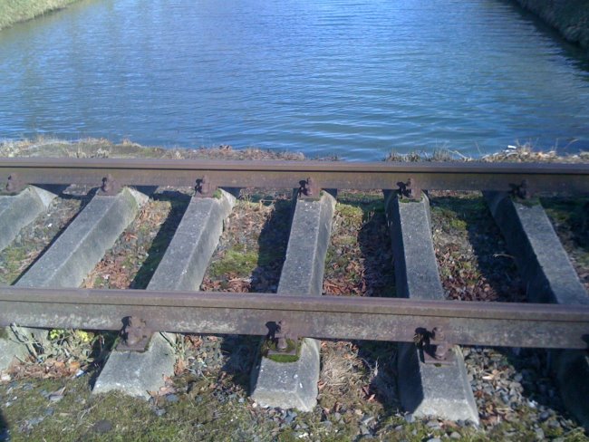 Es ist nur ein paar Meter lang, wo die Gleise am Wasser vorbei führen. Diese Gleise werden auch nicht mehr von einem Zug befahren, sondern von den Wagen der Grenzlanddraisine. Sie gleiten hier im Forstgarten am Prinz-Moritz-Kanal vorbei und halten kurz an, um den Fahrgästen einen der schönsten Anblicke von Kleve geniessen zu lassen: den auf Kanal, Eisernen Mann, Amphitheater mit Minerva und Ceres-Tempel, sowie dem Kupfernen Knopf.