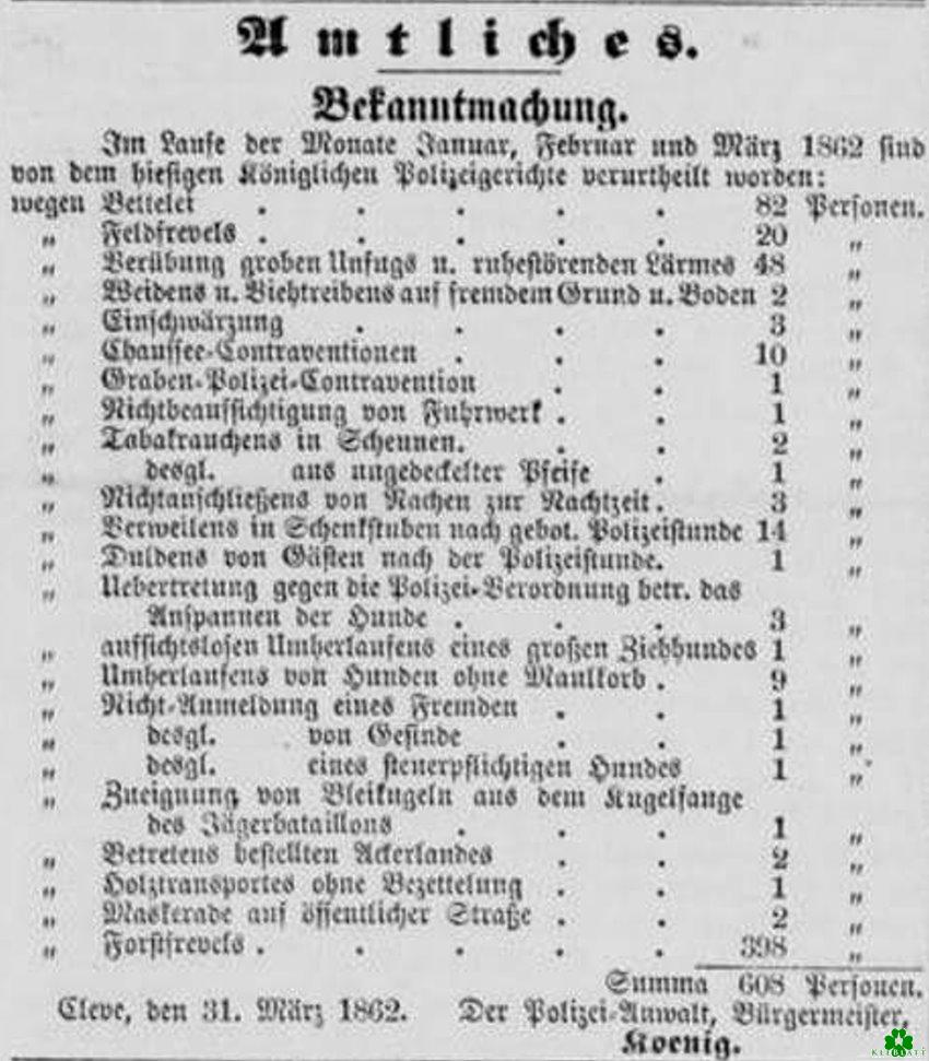 Interessant ist diese öffentliche Liste von Vergehen aus dem Jahre 1862, auf der einige Untaten stehen, die auch heutzutage noch eine Bestrafung nach sich zögen. Komischerweise liegt mit 398 Fällen der Forstfrevel ungeschlagen an der Spitze.