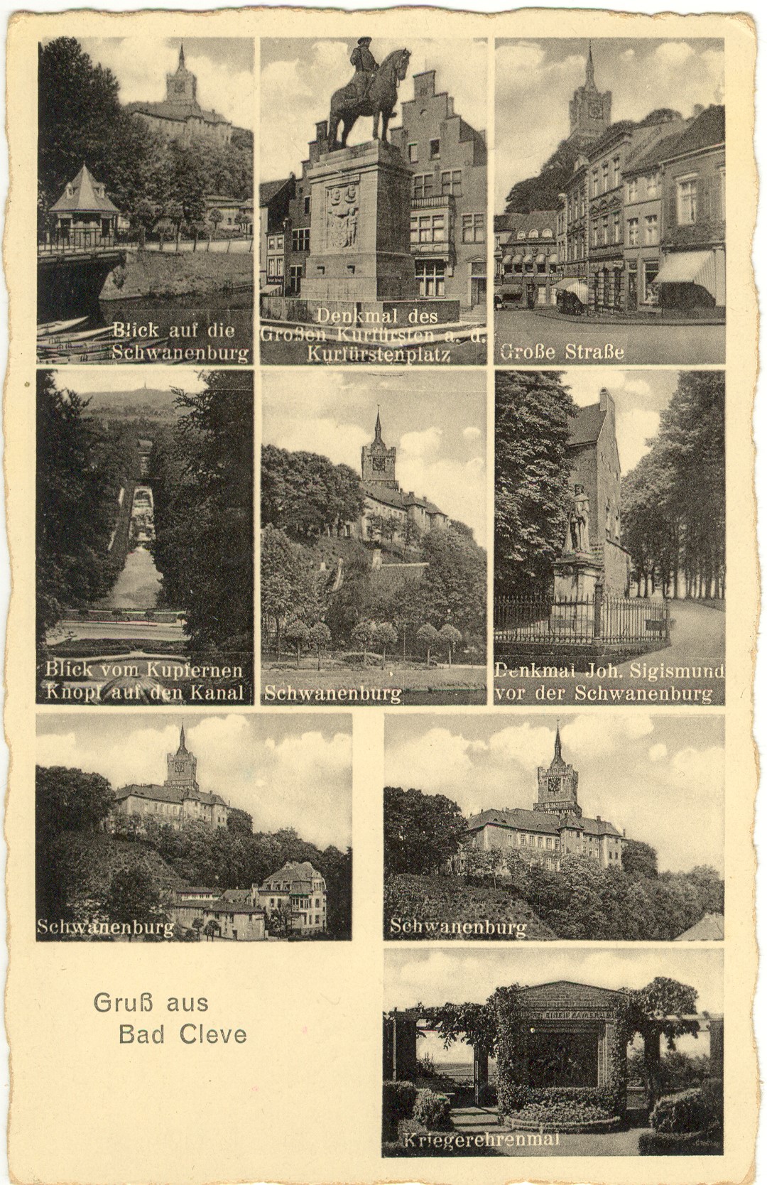 Diese Ansichtskarte aus dem Jahre 1933 zeigt eine Menge Klever Geschichte. Allein vier verschiedene Ansichten auf die Schwanenburg, das Denkmal des Großen Kurfürsten auf dem Kurfürstenplatz, die Große Straße am Fischmarkt, den Blick vom Kupfernen Knopf (hier wurde mal auf den martialischen Namen „Kriegerdenkmal“ verzichtet) auf den Kanal, das Denkmal von Johannes Sigismund, welches damals vor der Schwanenburg stand und das Kriegerehrenmal im Reichswald.