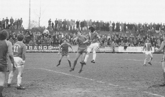Das Bild zeigt ein Derby im Jahre 1977, als der lokal bekannte Spieler des Sportclubs – Manni Priewe – den 1:1 Ausgleich köpfte.