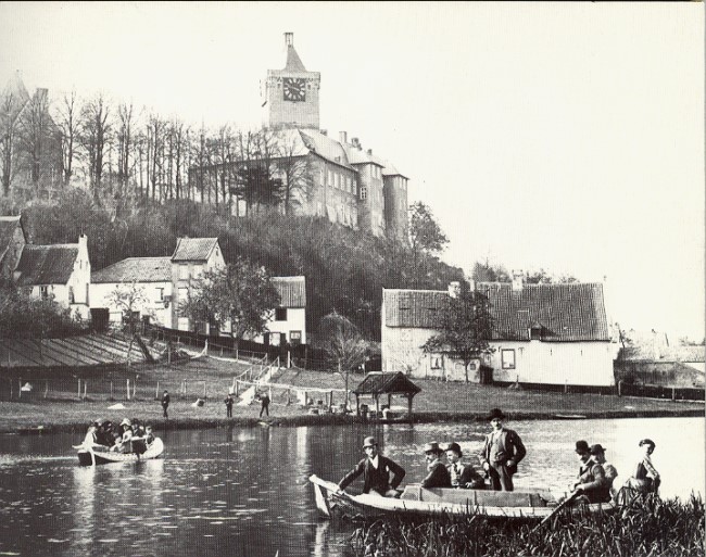 Wir schauen hier auf den Bleichenberg über dem die Schwanenburg thront mit ihrer damals schwarzen Uhr. Auf der ehemaligen Bleich-Wiese stehen einige neugierige Zuschauer am Ufer.