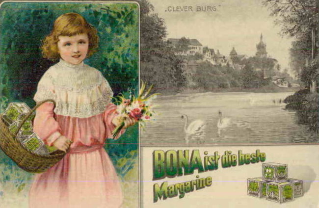 Speziell für die „beste Margarine“ Bona brachte man diese Werbekarten auf den Markt mit verschiedenen Klever Motiven aus dieser Zeit.