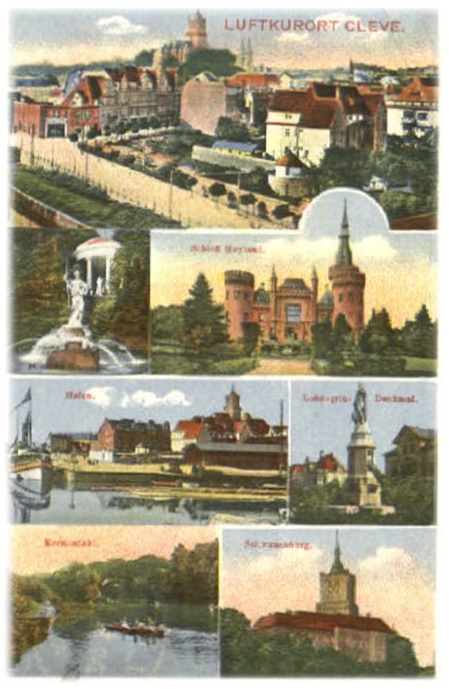 Im Jahre 1920 war die Farbfotografie noch nicht ausgereift und so wurden die üblichen schwarz/weiß-Bilder einfach koloriert. Das damit eine Menge Authentizität verloren ging und das Meiste nicht der Realität entsprach, kann man sich leicht vorstellen. Trotzdem sehen wir hier ein wundervolles Zeugnis der Stadt Kleve, wie sie sich in den „Goldenen Zwanzigern“ dem Betrachter darstellte. Oben ein Stadt-Panorama, wo man links noch das alte Lichtspielhaus sehen kann. Dann natürlich die üblichen Motive, wie Amphitheater, Schloss Moyland, Hafen, Lohengrin-Denkmal, Kermisdahl und natürlich Schwanenburg.