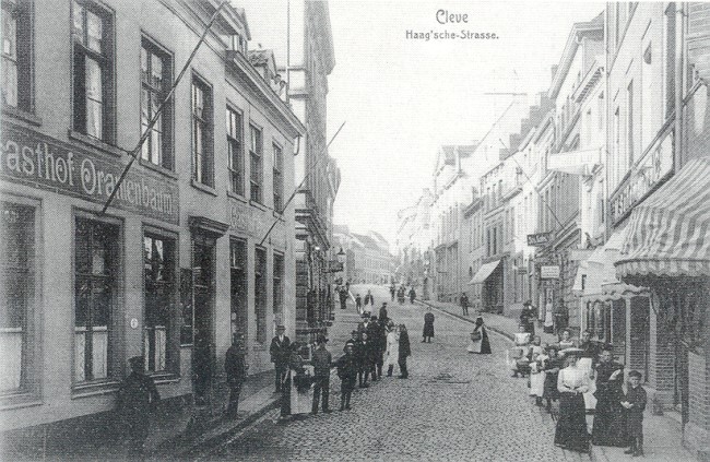 Direkt gegenüber sehen wir dann den Gasthof „Oranienbaum“ – im Volksmund auch „Oranjeboom“ genannt. Man soll es heute nicht glauben, aber Kost und Logis gab es in diesem Klever Hause bereits ab 1,50 Mark. Das war allerdings noch vor dem ersten Weltkrieg. 😉
