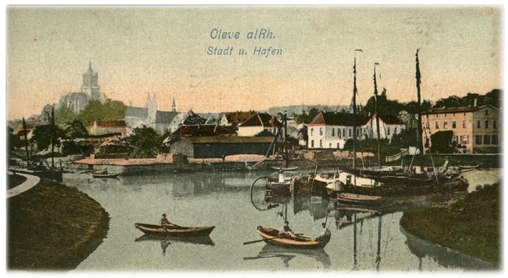 Wunderschöner alter Blick vom Hafen aus auf die Stadt Kleve mit dem historischen Schwanenturm.