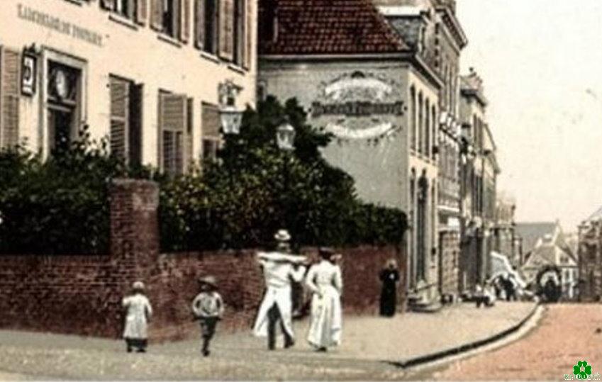 Wir sehen hier runter auf die Hagsche Strasse. Der Mann mit der Schürze trägt etwas auf seiner Schulter. Ein französisches Baguette? Oder was könnte das sein? Allerdings hat es den Anschein, als würde ihm beim Gespräch mit der ihm begleitenden Dame der Hut vom Kopf abheben. Nun, es kann natürlich auch eine optische Täuschung sein, denn er verdeckt wohl den Großteil eines Radfahrers, der in seinem Blickwinkel steht.