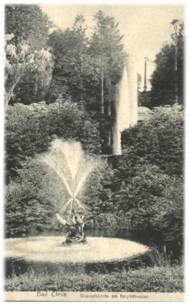 Es ist schon so einige Jahrzehnte her, als das Klever Amphitheater so aussah und man – wie auf der Karte zu lesen ist – noch von Wasserkünsten sprechen konnte. Hoch schießen die Fontänen in die Luft und begeisterten die Menschen, die dort Erholung suchten. Bäume und Sträucher wuchern urwüchsig und wild und selbst der Cupido schleudert sein Wasser in den Teich.