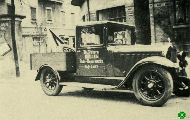 Zu Zeiten, als dieses Foto gemacht wurde, gab es im Klever Stadtgebiet zahlreiche Litfaß-Säulen, die damals der Werbung dienten. Auch heute sehen wir sie noch, wie zum Beispiel auf der Kavarinerstraße und vor dem Tiergarten. Das Auto der Firma Th. Peters wirbt ebenfalls. In diesem Fall für den Auto-Reparaturbetrieb. Bei genauerem Hinsehen könnte man fast meinen, das das linke Vorderrad tatsächlich reparaturbedürftig zu sein scheint. 😉