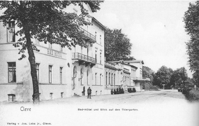 Der Schriftzug „Bad-Hotel“ ist auf dieser Ansichtskarte aus dem Jahre 1885 gut zu erkennen. Später bekam das Haus dann den Namen „Kur-Hotel“, was eigentlich beides korrekt ist, da ja neben dem Hotel das Friedrich-Wilhelms-Bad angebaut ist , aber das Hotel ebenfalls auch Kurgästen der damaligen Zeit als Erholungsort diente und den kürzesten Weg zu den „Zapfstellen“ des heilende Wassers der Klever Quellen darstellte.