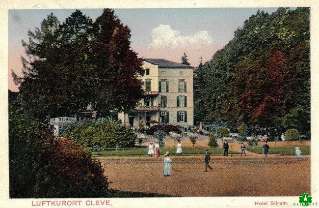 Ein wahrhaft prächtiges Bild vom ehemaligen Hotel Stirum an der damaligen Tiergarten-Allee. Es scheint ein Sonn- oder Feiertag zu sein, denn man mag kaum glauben, das die Menschen damals so gekleidet im Alltag herum liefen. Andererseits könnten es Kurgäste sein, die speziell in diesem Bereich zahlreich anzutreffen waren, denn Kurhaus, Friedrich-Wilhelms-Bad, Stahlbrunnen und Amphitheater befanden sich direkt gegenüber.