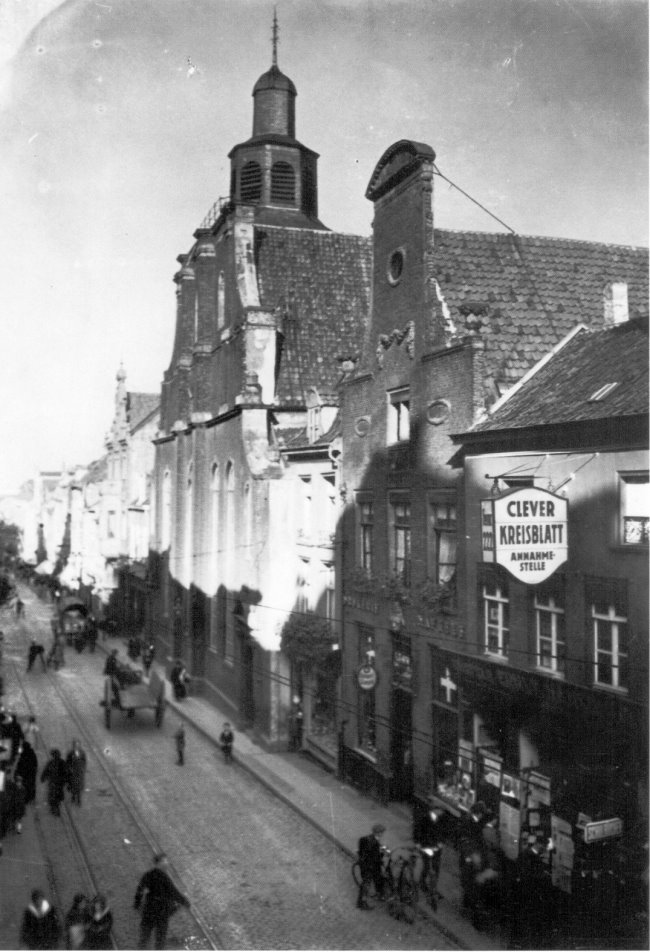 In der Bildmitte sehen wir die Reformierte Kirche den Bildausschnitt dominierend. Sie war bereits in 1676 errichtet worden. Daneben ein niedriges Haus, in dem der Maler Matthias Tinthoff wirkte. Im Anschluss daran das Gebäude mit dem Glockengiebel aus 1697 der Drogerie Naegele und schließlich das Haus der Annahmestelle vom „Clever Kreisblatt“, wie unschwer zu übersehen.