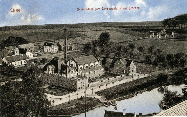 Auf vielen Ansichtskarten kann man unterschiedliche Schreibweisen wie: Kermesdahl, Kermisdahl, Kermesdaal oder auch Kirmesdahl lesen. Auf dieser prachtvollen Ansicht des alten Cleve steht „Kermesdahl vom Schwanenturm aus gesehen“. Und dabei unterschlägt man das zentral abgebildete prachtvolle Stadt-Bad, das eigentlich den Blickfang dieser Karte darstellt. Unterhalb des Gebäudes sieht man noch eindrucksvoll die damalige Anlegestelle für Boote, die Gäste und Besucher über die Klever Wasserstraße beförderten, sei es zum Vergnügen oder als Transit-Mittel zum nahe gelegenen Hotel Maywald.