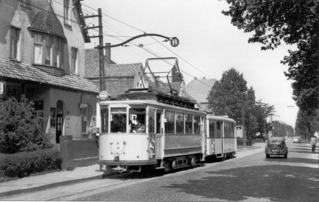Hier befand sich im Jahre 1955, als dieses Bild entstand, eine Haltestelle der Straßenbahn. Im Haus selbst gab es neben der Gaststätte auch noch ein Postamt. Wir sehen die Emmericher Straße noch gepflastert.