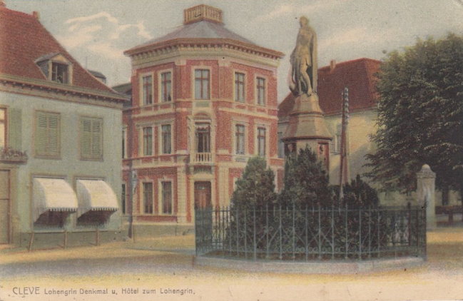 Das Hotel „Zum Lohengrin“ am Kleinen Markt Zu Zeiten, als das Lohengrin-Denkmal noch auf dem Kleinen Markt in Kleve stand, befand sich dort auch das Hotel „Zum Lohengrin“, wie man auf dieser alten kolorierten Karte sehen kann.