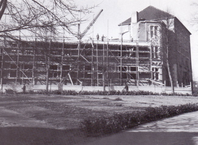Leider war der komplette Ostflügel des Staatlichen Gymnasiums den Kriegsbomben zum Opfer gefallen. Somit ging es Anfang 1950 an Aufbauten des Lehrinstituts. Der Erweiterungstrakt an der Ringstraße wurde letztlich im Herbst des Jahres 1955 bezugsbereit fertiggestellt.
