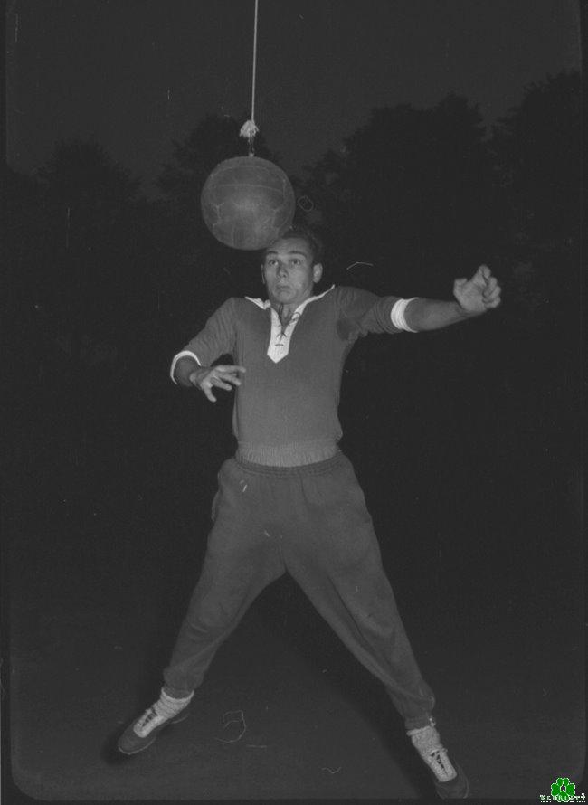 Die älteren Fans der beiden damals existierenden Klever Fußball-Vereine Sportclub und VfB werden wissen, wer dieser fleißige Arbeiter ist, der hier am Pendel seine Kopfball-Technik versucht zu verbessern und welchem Club er angehörte.