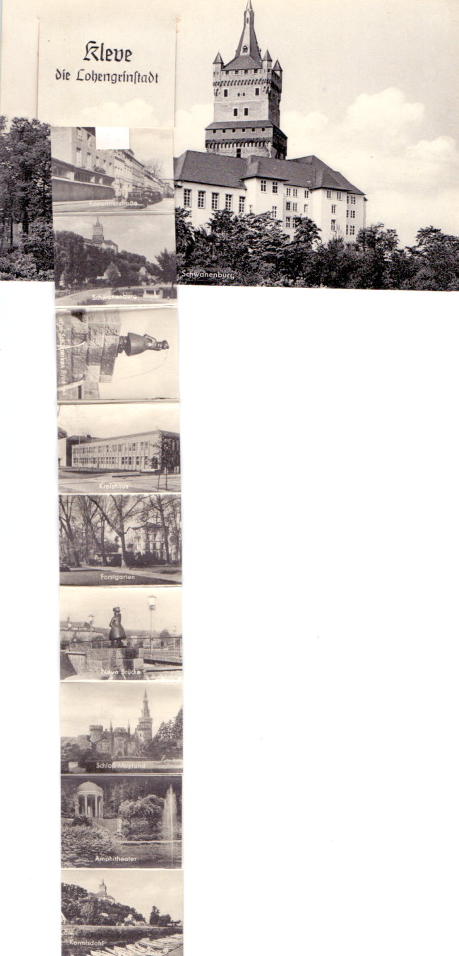 Mitte der Fünfziger kam diese Ansichtskarte mit einem Leporello der Lohengrinstadt Kleve auf den Markt. Es zeigt die Schwanenburg und hinter dem Klappfenster mit der Aufschrift „Kleve die Lohengrinstadt“ konnte man noch 10 weitere Ansichten entdecken.