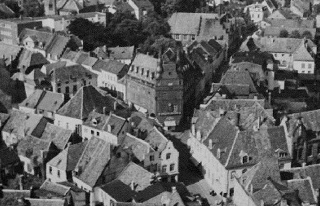 Wo sich einstmals das Cafe‘ Schürings befand und heute der Eingang zur Neuen Mitte in Kleve ist, treffen sich die Große Straße, die Hagsche Straße und die Stechbahn. Dieses besondere Gebäude sticht alleine durch seinen extravaganten Baustil ein wenig heraus, was sicher auch an den beiden wuchtigen Türmen gelegen hat, die an der oberen Dachfront in den Himmel ragten.
