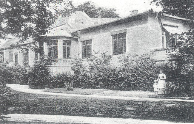 Die Aufnahme stammt aus der Jahrhundertwende und hat einigen Seltenheitswert. Vor dem Eingang des ehemaligen Hotels Prinzenhof, dessen Dächer man im Hintergrund erkennen kann, sieht man hier das alte Teehaus, das sich vor dem Eingang befand. Dazwischen zeigte sich der langgestreckte Saalbau.