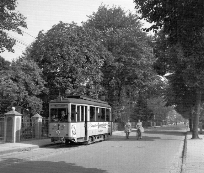 Es sieht eher aus wie die Lindenallee, aber es ist hier im Jahre 1960 tatsächlich die Emmericher Straße. Sie war gerade asphaltiert worden. Die Straßenbahn fährt stadteinwärts und muss sich der an sonnigen Tagen größten „Konkurrenz“ erwehren: den Fahrrädern. Autos waren noch Mangelware.