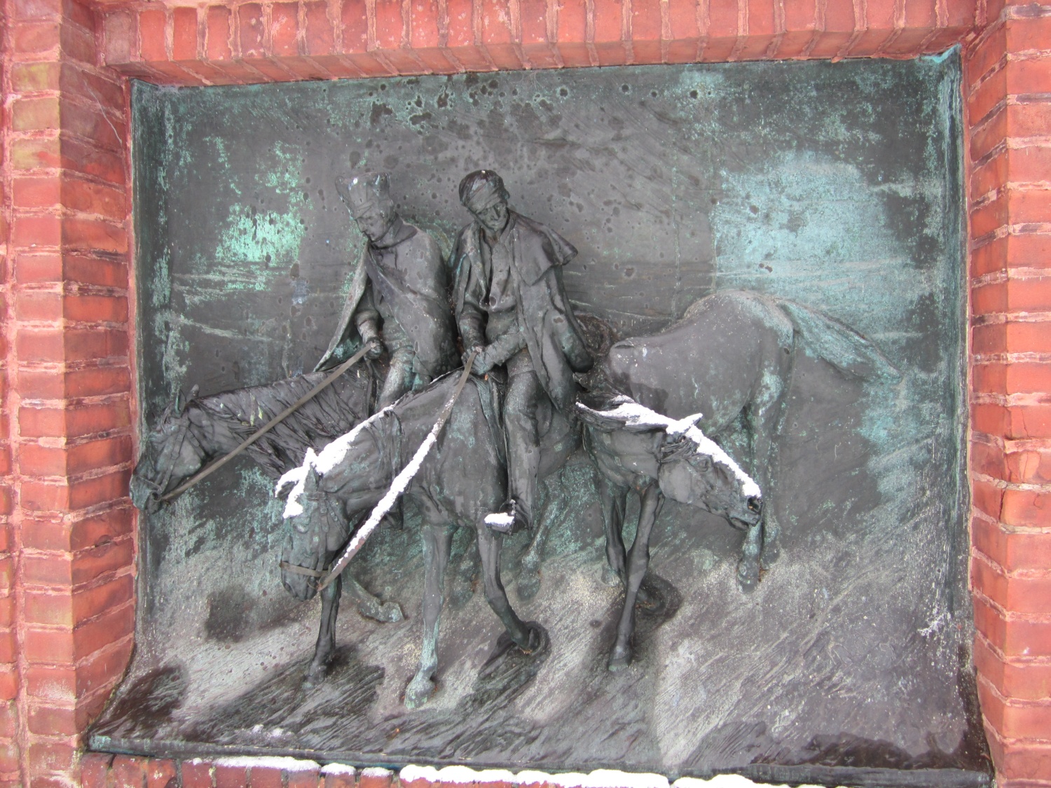 Das Denkmal zeigt zwei traurige Reiter mit einem dritten, Reiter losen Pferd, welches den Kopf suchend zurückwendet.