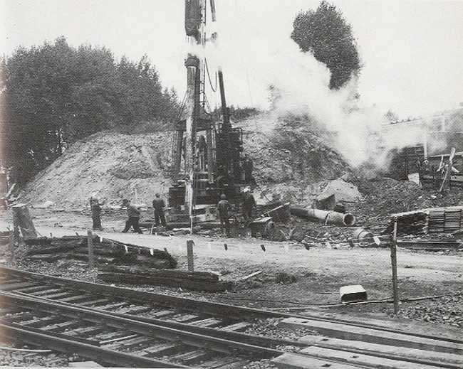 Um diesem Mißstand abzuhelfen, baute man die Rampenbrücke, die einen ungehinderten Verkehrsfluss gewährleistete. Sie wurde im Jahre 1965 fertiggestellt. Genau am Tag vor der Einweihung der Rheinbrücke. Hier sehen wir die Arbeiten am bereits jahrelang vorher aufgeschütteten Erdwall.