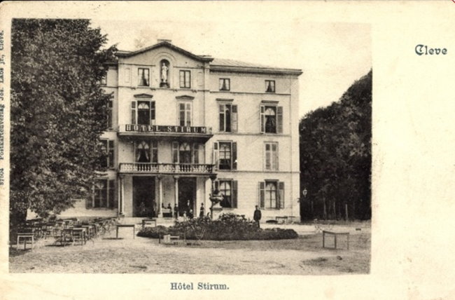 Es gab tatsächlich bereits sehr früh auch Biergärten in Kleve. Selbstverständlich – denn man musste den Besuchern des Forstgartens, des Tiergartenwaldes und den Kurgästen an warmen Sonnentagen auch etwas bieten. Hier sehen wir den Biergarten von Hotel Stirum auf der linken Seite. Noch hat kein Gast Platz genommen, aber das dürfte sich hier im Sommer 1901 sehr schnell geändert haben. Wo gibt es das bei uns heute denn noch? Bitte Ideen liefern.