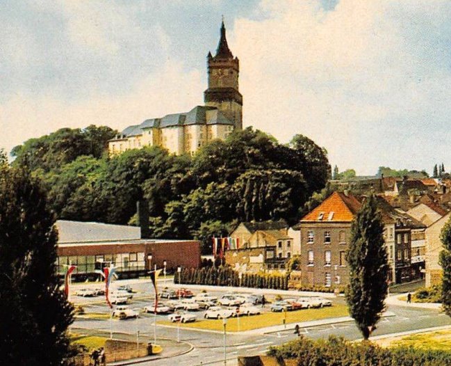 Es wurde wohl etwas in Kleve gefeiert, als dieses Bild entstand. Es ist rundum bunt geflaggt an der Stadthalle. An der Lohstätte ist noch nichts so gebaut, wie man es heute kennt. An den Autos kann man erkennen, das es sich hier wohl um die Sechziger handelt. Dort wo das heutige Spoy-Center unten rechts beginnt, war damals ebenfalls noch ein Parkplatz.