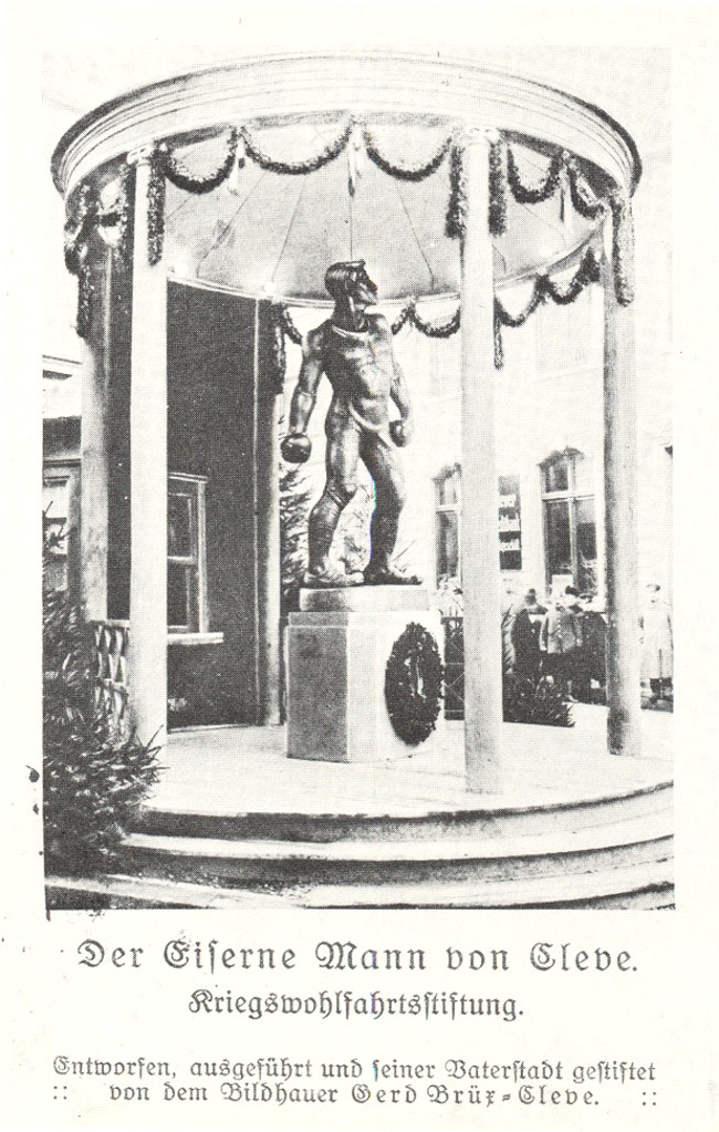 Allerdings kennt kaum jemand den echten Eisernen Mann, den der Klever Bildhauer Gerd Brüx anfertigte und im Jahre 1916 am Fischmarkt aufstellte. Die prachtvolle Statue maß stolze 2,30 Meter, war allerdings aus Holz gefertigt.
