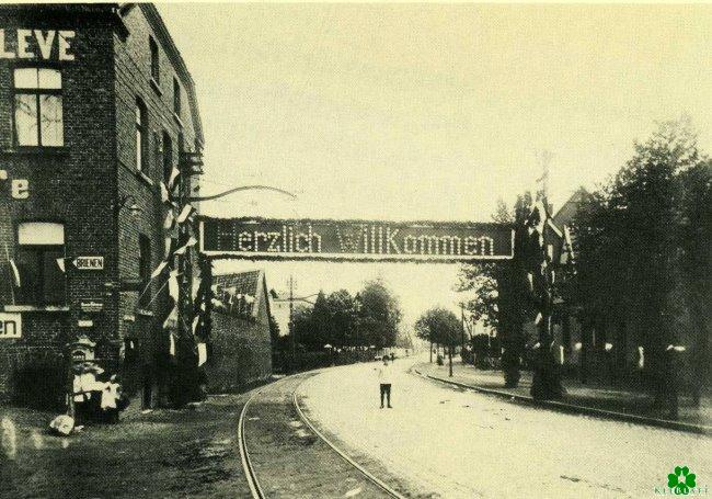 Irgend etwas war zur Zeit der Entstehung dieses Bildes in Kellen los. Man sieht es an der Beflaggung und dem beleuchteten Willkommen-Schild. Reichlich Verkehr herrschte hier auf der Emmericher Straße allerdings noch nicht. Wir erkennen auch das Band der Straßenbahn-Schienen. Ein Junge steht einsam mitten auf der Fahrbahn und erwartet…was? Das Gebäude links beherbergt heute das griechische Restaurant „Athen“.