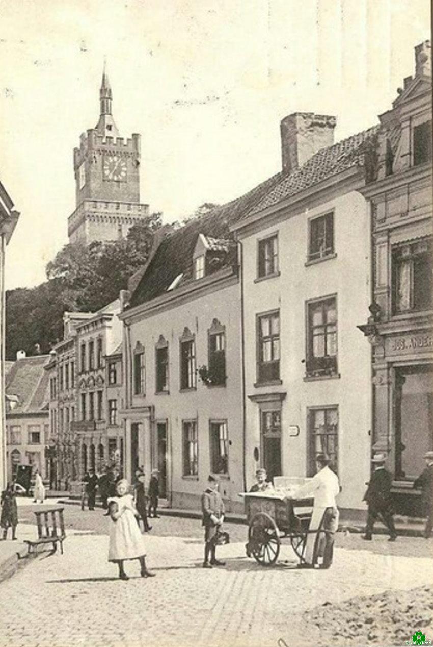 Ein wundervolles Bild aus längst vergangenen Zeiten, auf dem man sehen kann, wie es vor über 100 Jahren in Kleve war. Wir sehen einen Eisverkäufer auf der Hagschen Strasse, die derzeit noch komplett gepflastert war. Die Kinder warten sicher sehnsuchtsvoll auf ihre Eltern, damit sie sich ein Eis kaufen können bei dem Mann mit der langen Schürze.