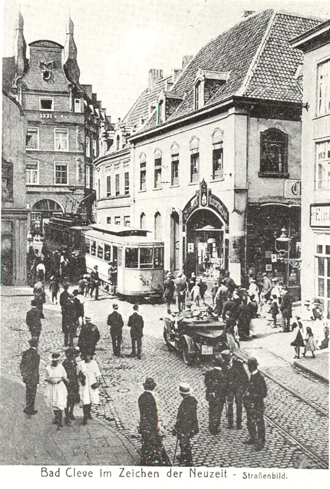 Die „Elektrische“, wie die Straßenbahn zu dieser Zeit noch genannt wurde, passiert gerade den Fischmarkt und fährt hoch auf die Hagsche Straße. Ein wundervolles altes Stadtbild von Bad Cleve in der „Neuzeit“.