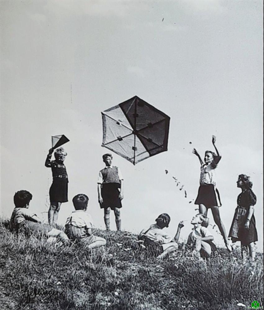 Hier lassen Klever Kinder ihre Drachen steigen. Bei dem größten Fluggerät kann man leicht versucht sein anzunehmen, dass es sich hierbei um einen Regenschirm handelt. Allerdings sieht man noch den Papierschwanz, so das sich dieser Irrtum schnell aufklärt. Wer hat auch Drachen steigen lassen oder fröhnt noch immer diesem Freizeitvergnügen?