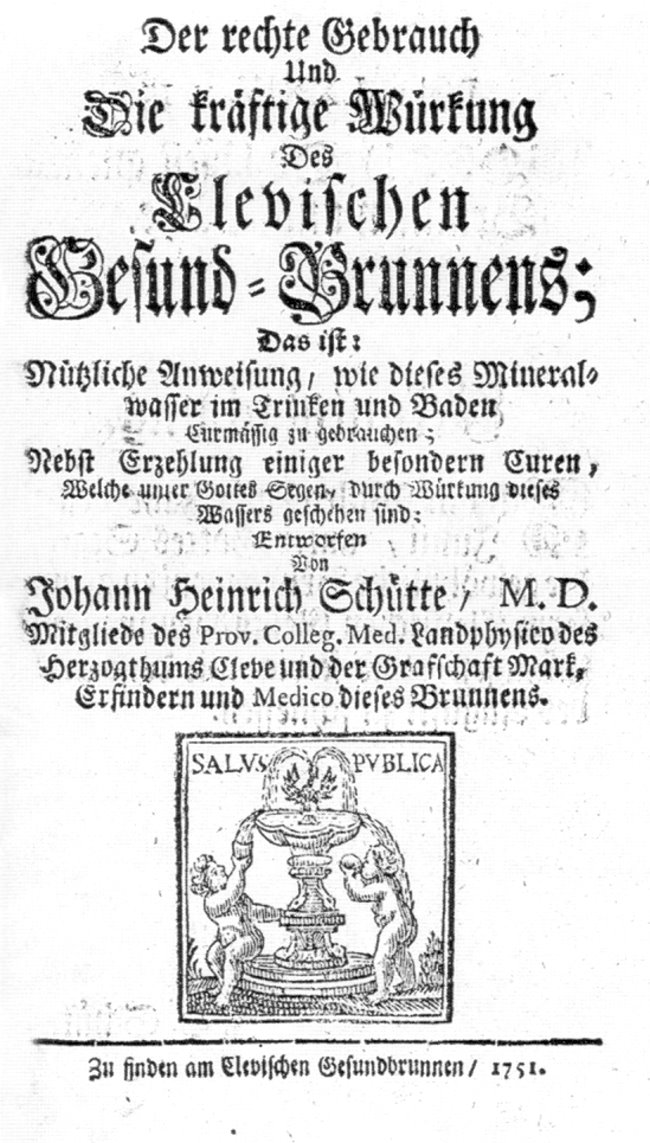 Die Entdeckung des Klever Heilwassers ist nicht, wie hier vielleicht vermutet, dem ersten Klever Medicus Johann Heinrich Schütte (1695-1774) zuzuschreiben, sondern dem Magister Johannes Blanckenhorn. Bereits im Jahre 1741 beschreibt er die physikalischen Eigenschaften des Eisens und alkalische Erden enthaltenden Wassers und seine damit verbundene Heilwirkung und empfahl deshalb die Nutzbarmachung der damals vier im Tiergarten austretenden Quellen. Drei dieser Quellen befanden sich links vom unteren Weiher des Amphitheaters und eine vierte, schwächere Quelle entsprang dem Butterberg.