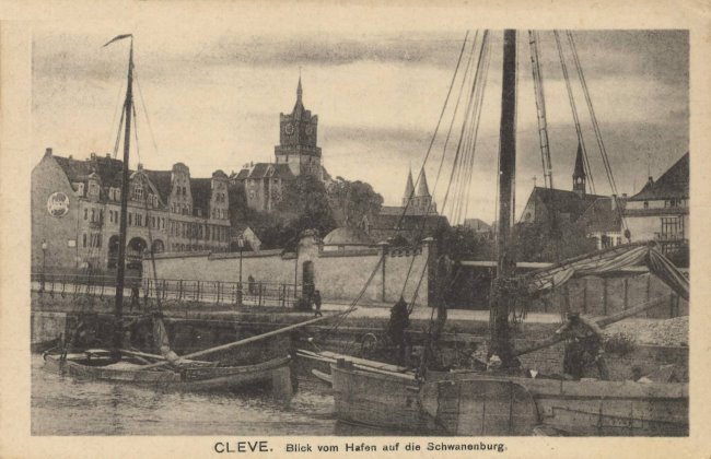 Ein prachtvoller Anblick mit den arbeitenden Schiffern auf ihren alten Kähnen, die Waren von und nach Cleve beförderten. Darüber hinweg schauen wir auf die Stadt, wie sie sich im Jahre 1921 darstellte. Wir erkennen unschwer die Schwanenburg, die Stiftskirche und die Minoritenkirche.