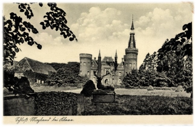 Eigentlich ist das Moyländer Wahrzeichen ja kein Jagdschloss sondern ein Wasserschloss. Aber hier sehen wir – eventuell erst auf den zweiten Blick – die große Figur eines stolzen Hirsches auf einem Sockel.