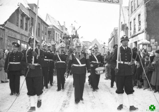 Die Straßen und die Dächer der Häuser waren weiß vom Schnee, als der erste Rosenmontagszug der Nachkriegszeit durch Kleve zog. Es war Anfang/Mitte der Fünfziger Jahre und es sollte bis Mitte der Siebziger dauern, das der Klever Karneval besser organisiert wurde und ein regelmäßiger Rosenmontagszug Einzug in die Stadt-Geschichte hielt. Wir sehen noch Anleihen an den Kölner Karneval. Die Prinzengarde hatte noch die gleiche Uniform mit hohen Helmen, wie die Kölner Garde zu diesen Zeiten. Im Hintergrund erspäht man den Prinzenwagen. Seine Tollität wurde damals noch von entweder seiner Frau oder einer Prinzessin begleitet. Die genauen Daten und Hintergründe wird ein eingefleischter Kenner des Klever Karnevals besser erläutern können.