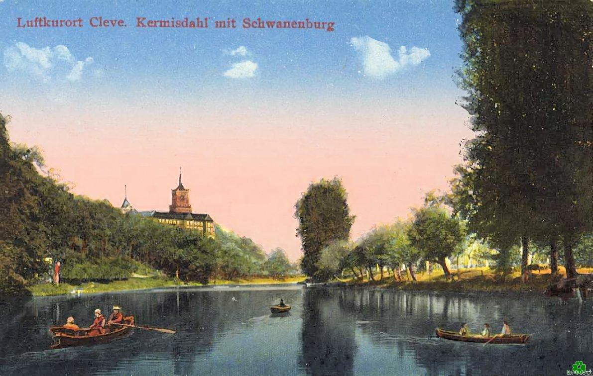 Der Kermisdahl im Luftkurort Cleve Diese farbenprächtig kolorierte Ansichtskarte zeigt die Schönheit der damaligen Klever Landschaft mit der Schwanenburg.