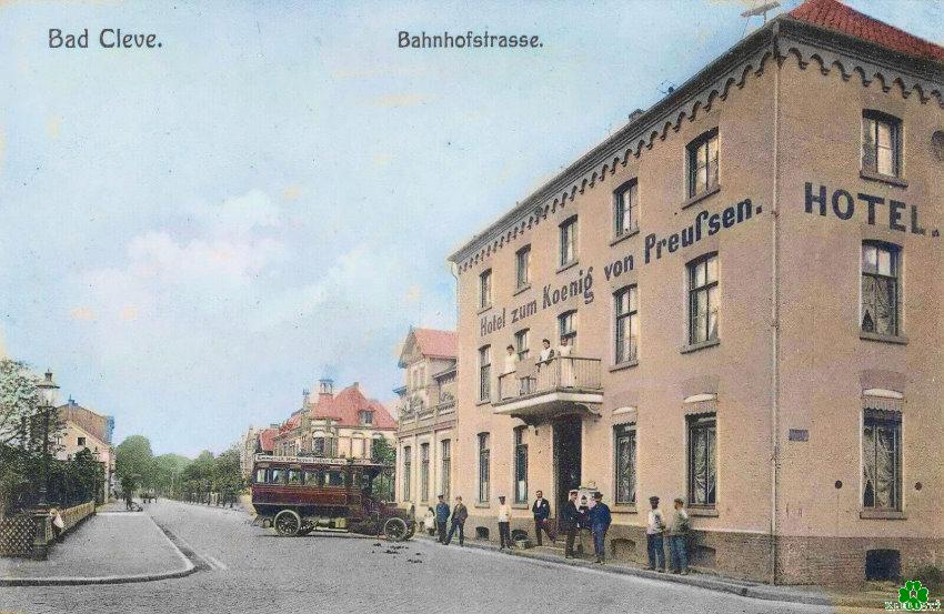 Ein prachtvoll koloriertes Foto aus anderen Zeiten. Man sieht einen Bus vor dem Hotel, da sich damals hier ja auch eine Station befand. Auch üblich die Pferdescheiße auf der Straße, die man hier gut entdecken kann. Natürlich ließ man sich auch gerne blicken, wenn ein Fotograf sein Stativ irgendwo aufbaute.
