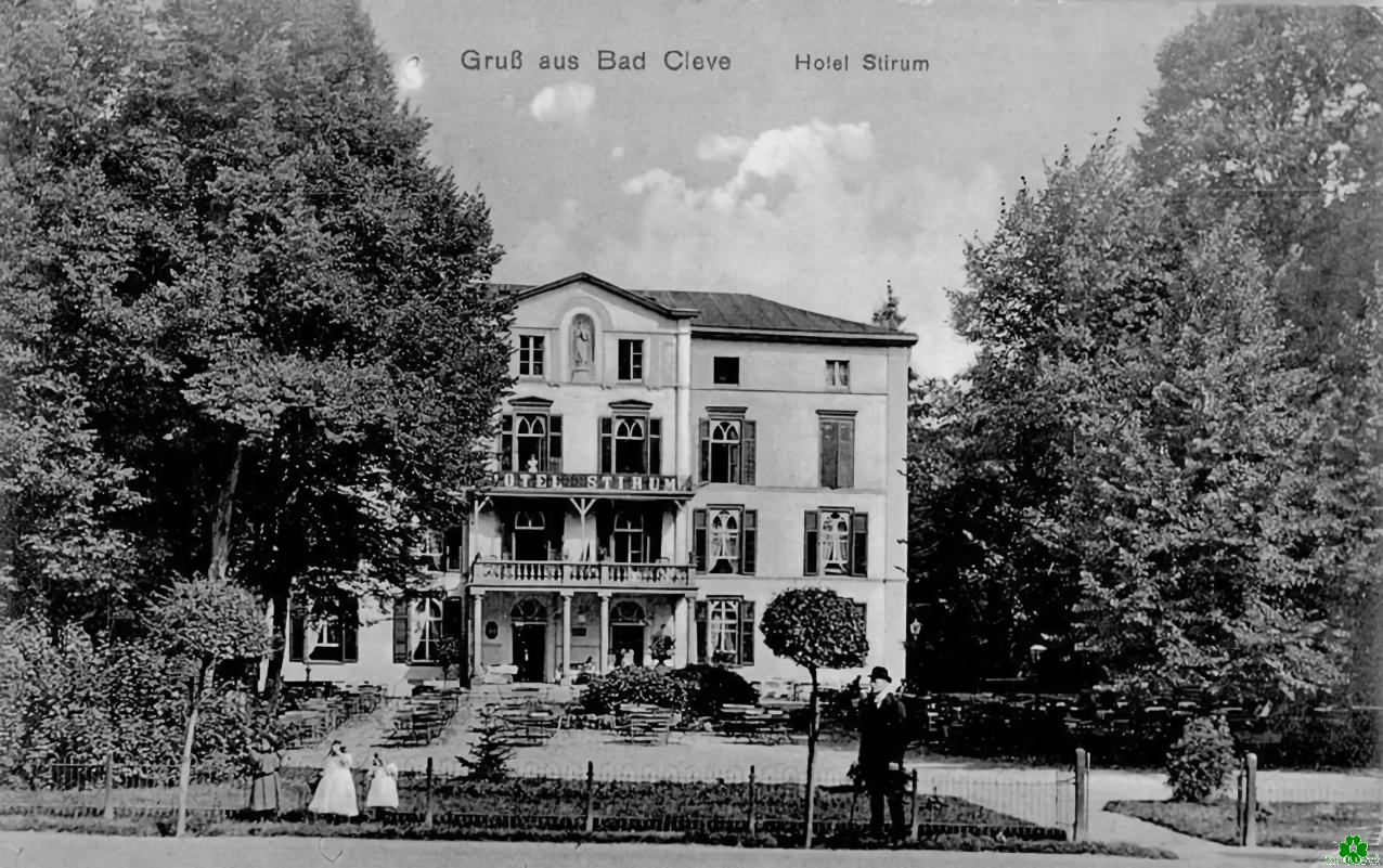 Es war sicher frühmorgens an einem schönen Sommertag, als dieses Foto entstand. Ein Spaziergänger steht in Pose, ebenso wie drei kleine Kinder auf der linken Seite in ihren schönsten Kleidern. Der vorgelagerte Biergarten des Hotels zeigt noch freie Stühle, was sich im Laufe des Tages sicher geändert haben dürfte, war hier doch ein beliebter Anlaufpunkt für die Klever:innen und auch Gäste aus nah und fern.