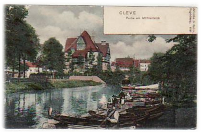 Auf der Karte steht „Partie am Mühlenteich“ in Cleve. Also hieß dieser Teil des Kermisdahl bei der Boots-Anlegestelle von Scho damals wohl so. Wir sehen einige Leute in den Booten. Warten die auf den Karten-Abreisser oder den Startschuss zur Ruder-Regatta? Wer weiß?