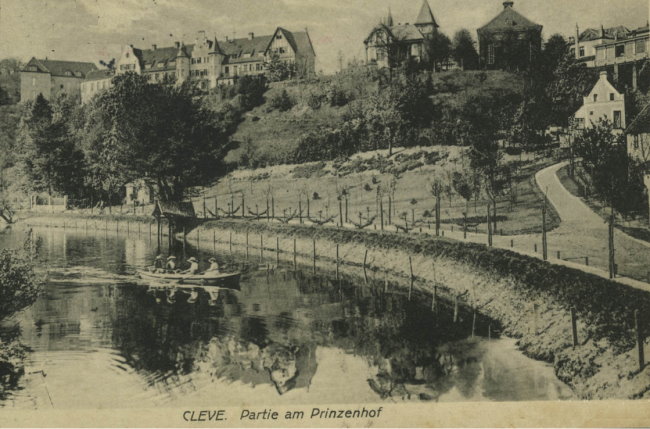 Vier Damen paddeln im Ruderboot von Scho über den Kermisdahl. Zu dieser Zeit hatten sie einen großartigen Blick auf das prachtvolle Hotel Prinzenhof, denn der Hügel vom Moritz-Park war noch nicht so bewachsen, wie er sich heute darstellt. Das fantastische Gebäude wurde leider komplett zerstört. Ein Jammer für Kleve und seine Gäste.