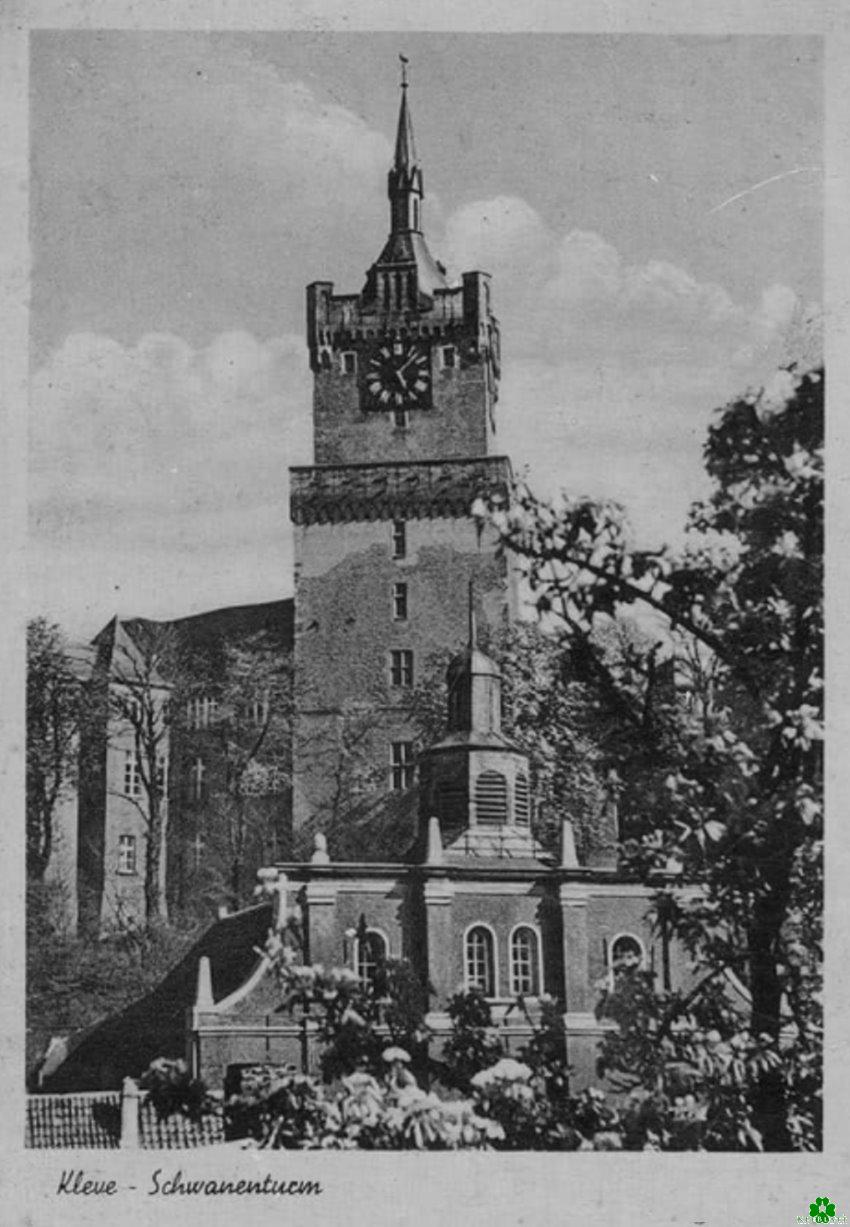 Der Schwanenturm im Frühling Ein altes Frühlingsbild zeigt uns im Vordergrund die Blüte eines Baumes. Dahinter sehen wir die Evangelische Kirche, die vom Schwanenturm überragt wird. So sah es auch mal aus in Kleve.