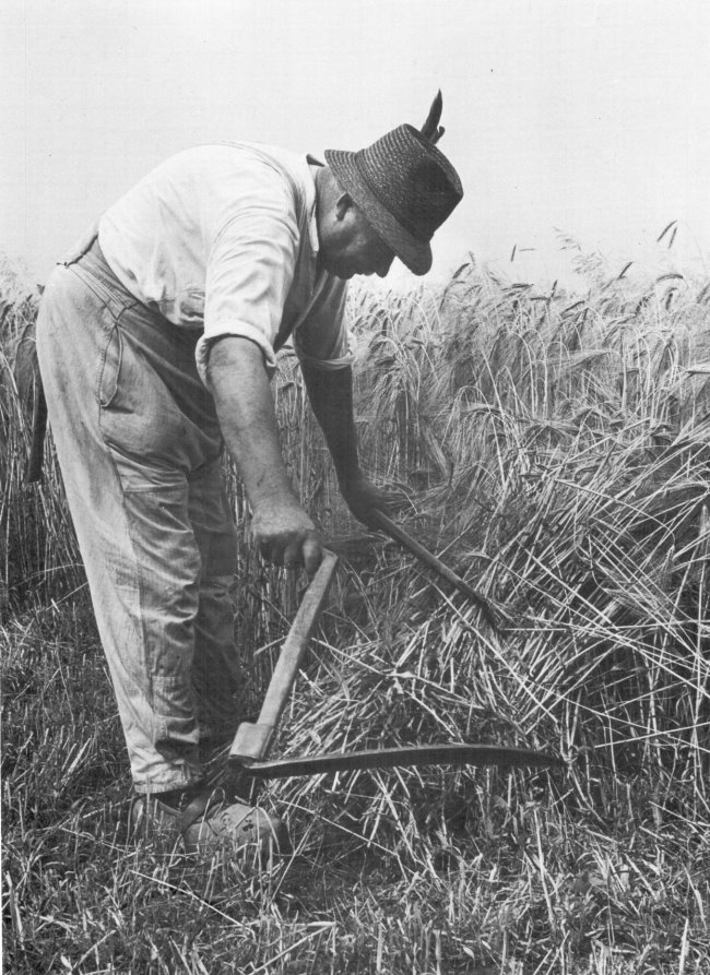 Als man noch nicht über die moderne Technik eines Mähdreschers verfügte, wurde das Getreide noch von Hand mit der Sense geschnitten. Hier sehen wir einen Fachmann bei der Arbeit. Der Schwung mit dem äußerst scharfen Schnitt-Gerät war eine Kunst für sich und musste vernünftig gelernt werden. Damit alles schneller ging zu dieser Zeit, holte man von weiter her Arbeiter bzw. Erntehelfer, die die Getreidefelder im Akkord abmähten.