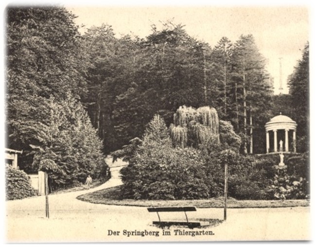 Es war zu Zeiten, als Ceres noch in ihrem Tempel stand und üppiger Grün-Bewuchs das Bild des Amphitheaters bestimmte. Die Fontänen schossen im Betrieb noch etliche Meter in die Höhe und gaben nicht nach 75 cm auf, wie es heute oft der Fall ist. Links am Bildrand sehen wir noch den Eingang zum Stahlbrunnen, in dem das eisenhaltige Heilwasser aus den Klever Quellen an die Kurbesucher verabreicht wurde.