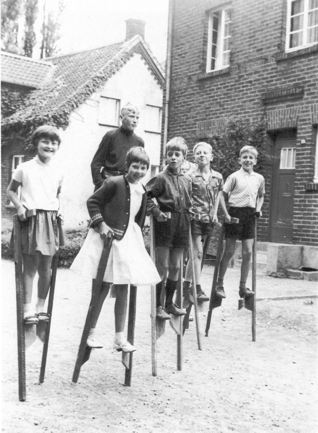 Im Klever Sommer der 50er und 60er sah man also zahlreiche „Stelzenläufer/innen“, die mit den vom Vater oder Opa geschnitzten Stelzen versuchten, so lange wie möglich das Gleichgewicht zu halten. Manche „Künstler“ brachten es dabei auf erstaunlich Fertigkeiten.