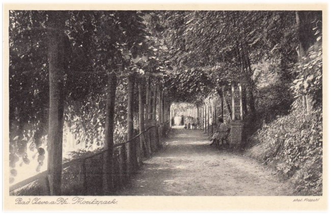 Es wird wohl kaum noch jemanden geben, der sich an diesen prachtvollen Durchgang im Moritz-Park erinnert. Es war noch zu Zeiten, als Kleve noch mit „C“ geschrieben wurde und Bäderstadt war. Eine sehenswerte Spaziergänger-Allee mit Ruhe-Bänken und aus Holz gefertigten Sicherheits-Geländern. Hier konnte man noch unberührte Natur und die frische Klever Luft genießen, die für den Namenszusatz der Stadt „Luftkurort“ verantwortlich war.