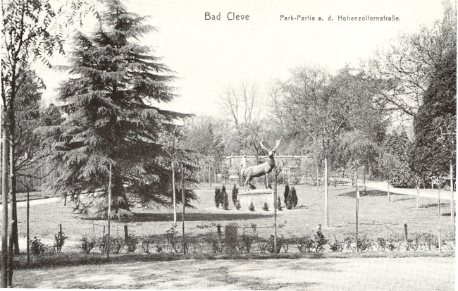 Die Mauer im Hintergrund gehörte zum alten Friedhof an der Lindenallee. Der Park lag also an der Ecke zur Frankenstraße, woran heute eigentlich nichts mehr erinnert. Der wunderschöne Park wurde mittig beherrscht von einer prächtigen Hirsch-Statue, die stolz auf ihrem Podest thronte.