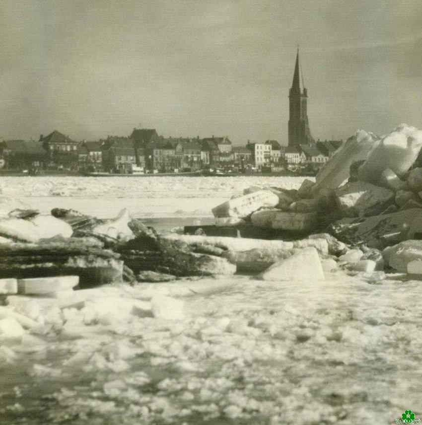 In der Vergangenheit gab es extrem kalte Winter im Kleverland. Hier sehen wir sehr dicke Eisschollen, die vom damals zugefrorenen Rhein stammten. Es war die Zeit, als man tatsächlich zu Fuß über das gefrorene Gewässer von Warbeyen bis Emmerich spazieren konnte.