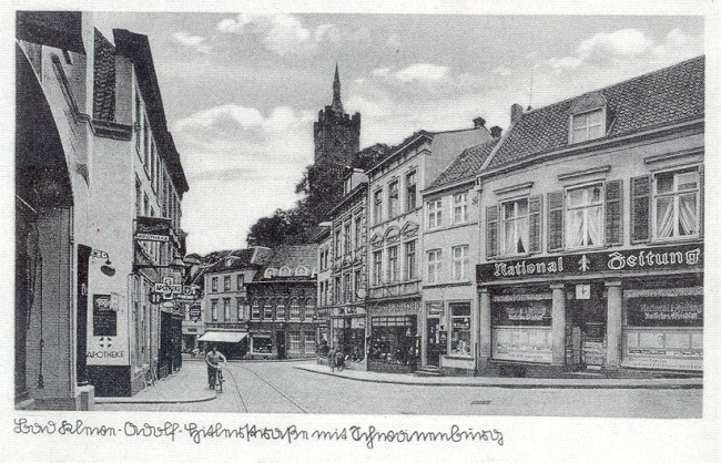 Die Karte zeigt die Hagsche Straße mit dem Haus der „National Zeitung“, die damals nicht nur Organ der Partei, sondern auch amtliches Organ der Stadt Kleve war. Dahinter gab es eine Kolonialwarenhandlung und eine Handlung mit Nähmaschinen, Fahrrädern und vieles mehr. Links eine Apotheke. Unten sieht man noch das Schloss-Cafe‘ an der Ecke Große Straße / Schloss-Straße.